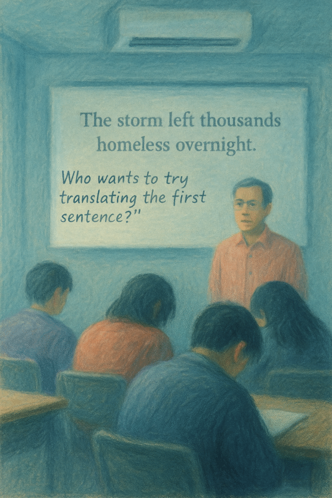 Pukul tiga sore, kelas penerjemahan dimulai. Mesin pendingin ruangan berdengung, mengembuskan udara dingin yang membuat kelas semakin beku. Di layar proyektor, kalimat bahasa Inggris tertera jelas. Namun di ruangan itu, sunyi lebih mendominasi daripada arti kata-kata.