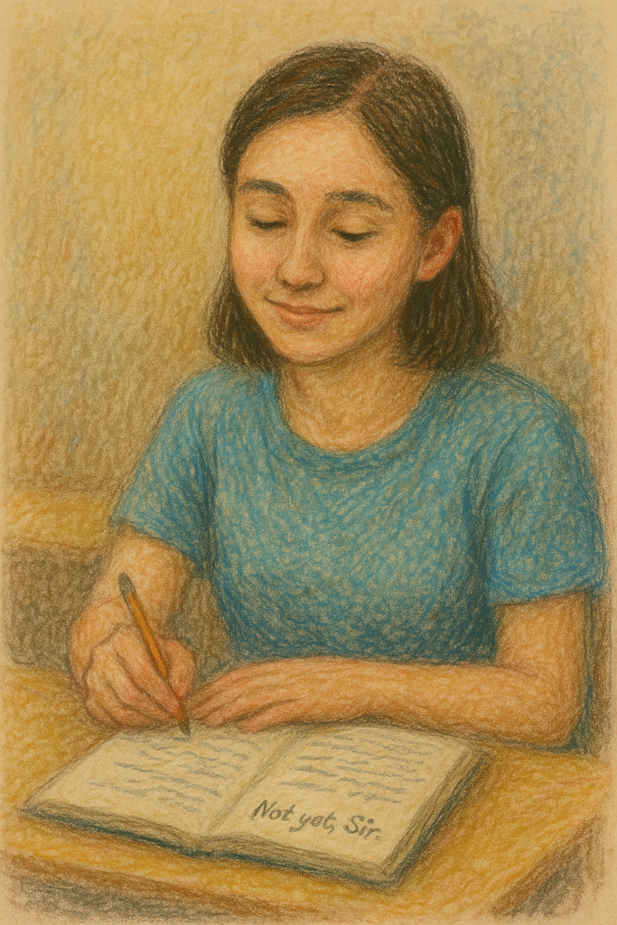 Di sisi kanan kelas, seorang mahasiswi selalu mengangguk setiap kali saya menjelaskan. Senyumnya ramah, seakan kata-kata sudah siap meluncur. Tetapi saat saya menunjuk namanya, ia menunduk, berbisik, “Not yet, Sir.”